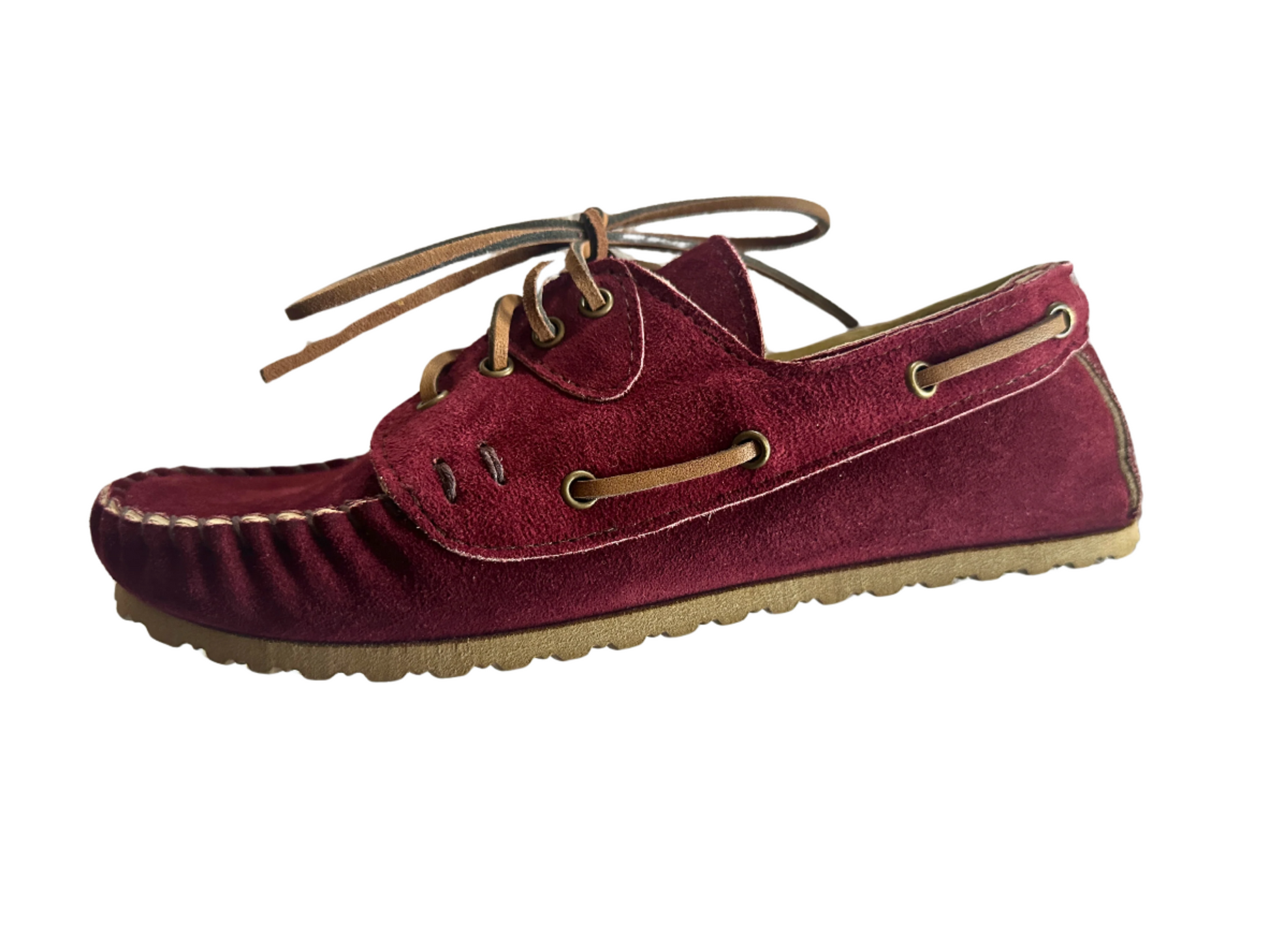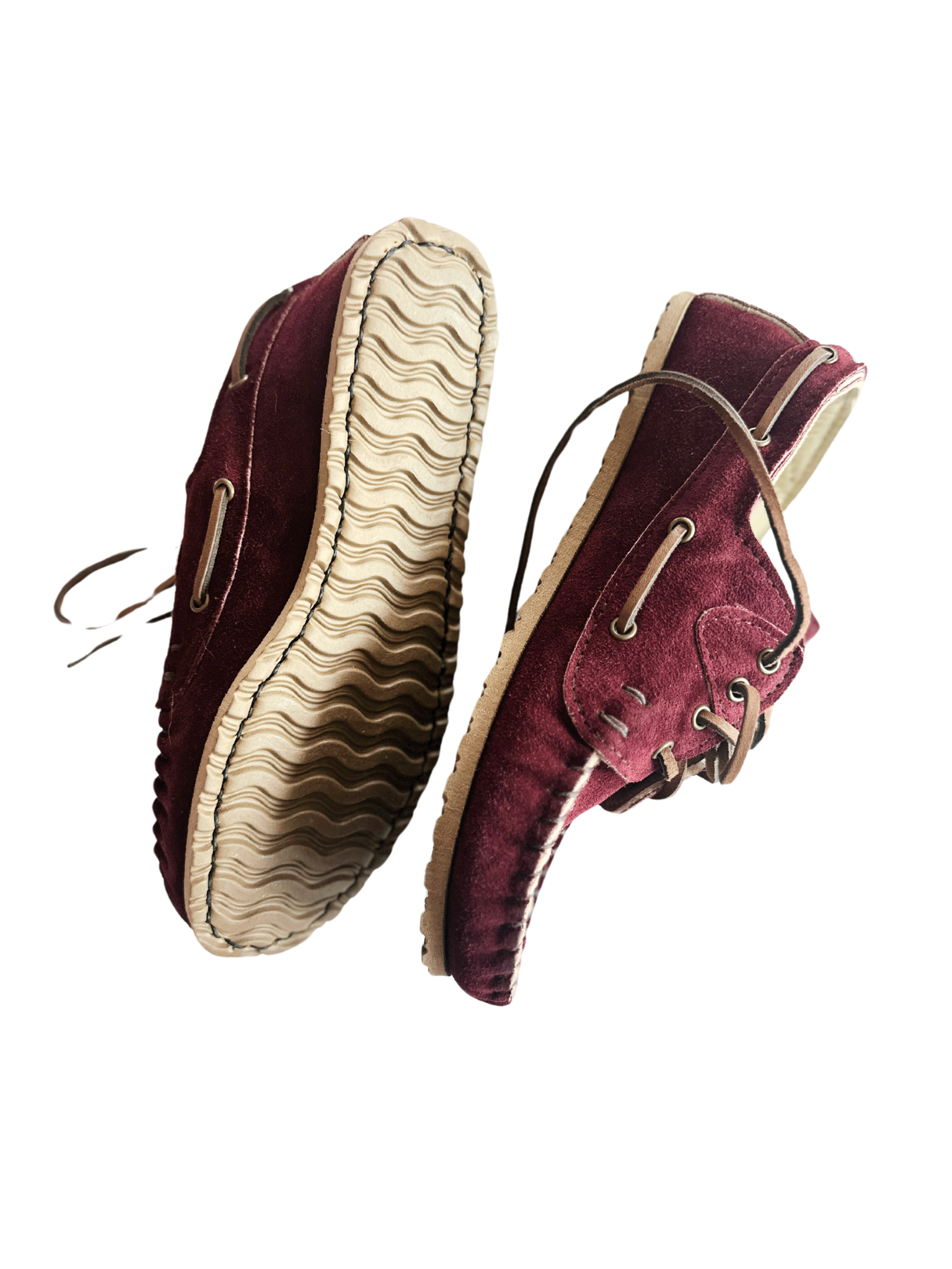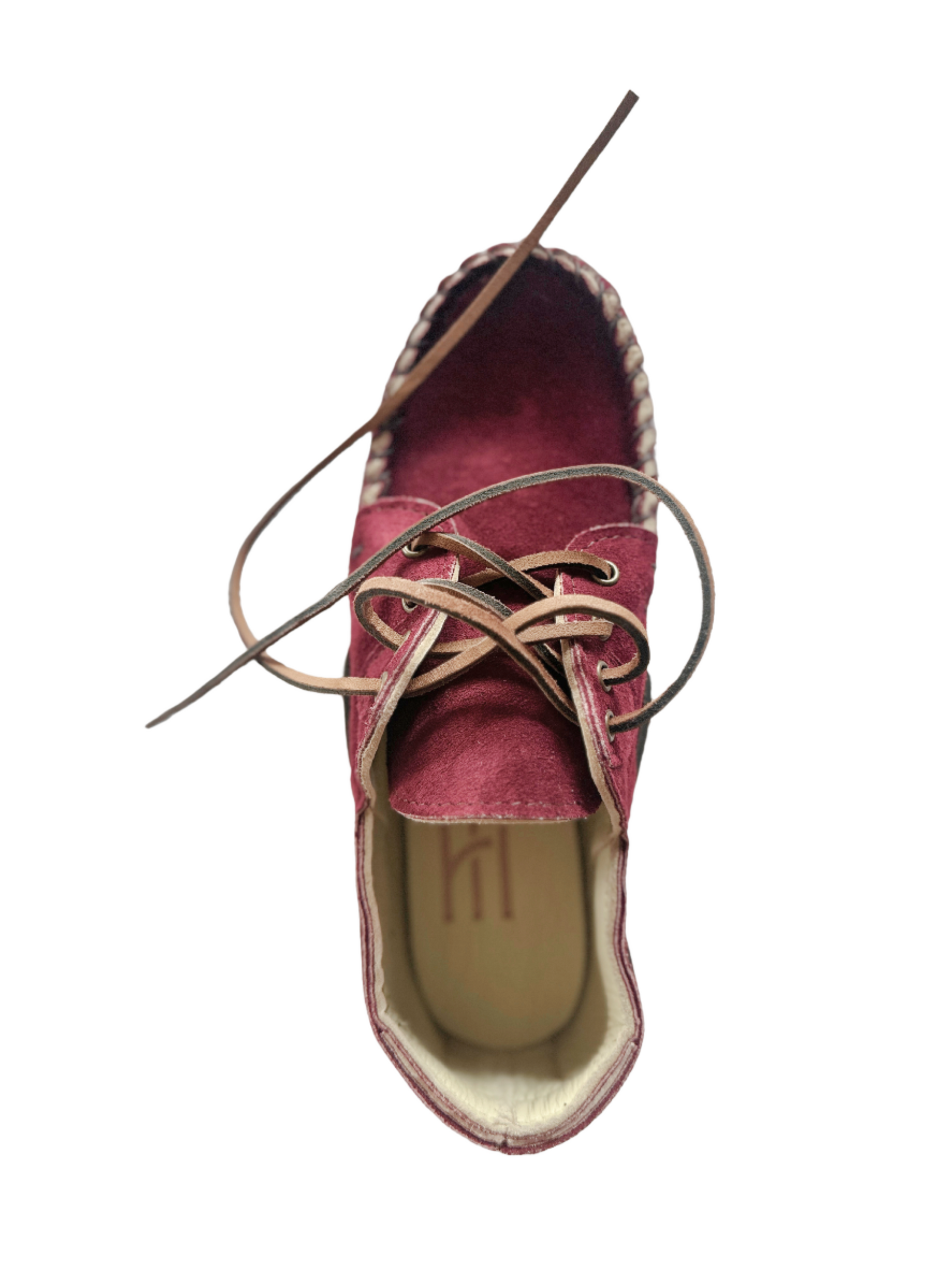 Crafted with precision, the Burgundy Oxford Moccasin features meticulous hand-sewing in a rich burgundy suede, complemented by a luxurious creme deerskin leather lining for an exceptionally comfortable fit. Distinctive attributes encompass the tread sole, eight elegant antique brass eyelets, and robust rawhide leather laces.