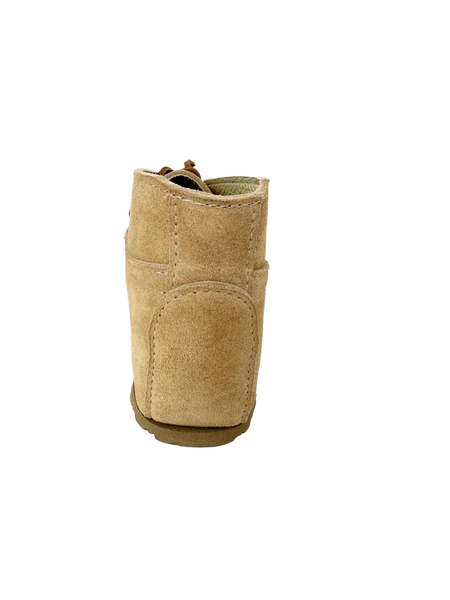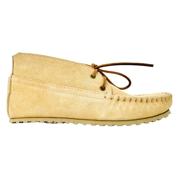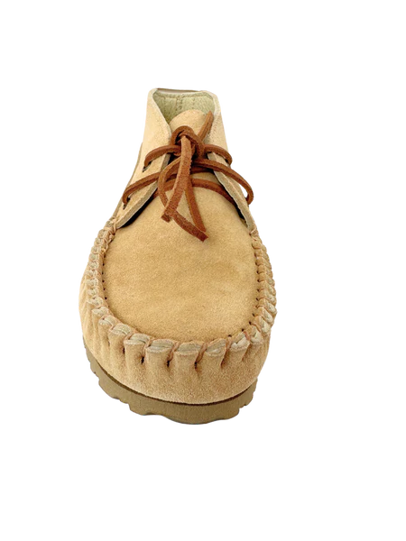 Crafted from suede and featuring a luxurious creme deerskin leather interior and insole for unparalleled comfort, the Camel Chukka is meticulously hand-sewn. Noteworthy elements comprise a 7mm non-slip tread flex sole, two antique brass eyelets, and rawhide leather laces.