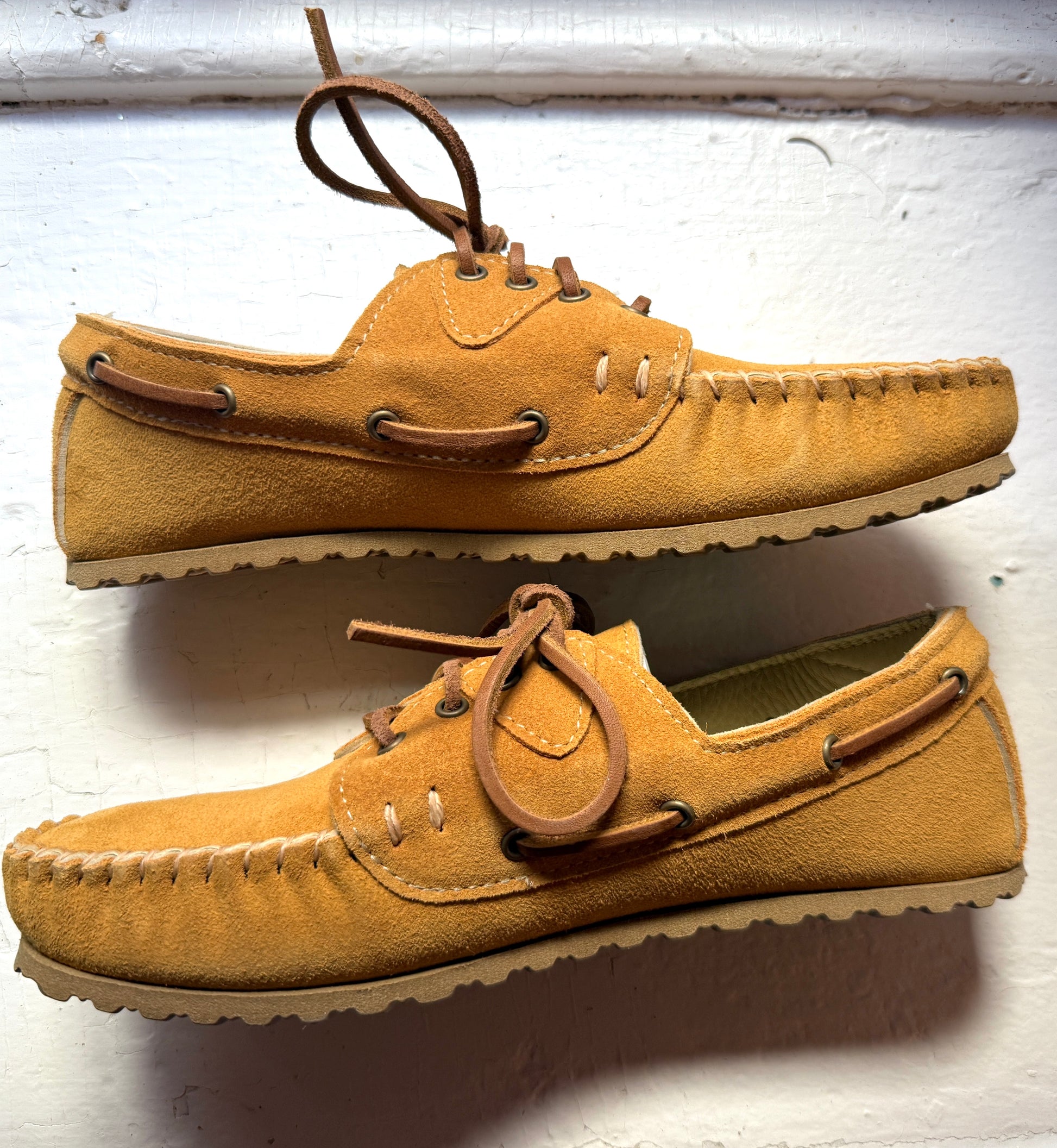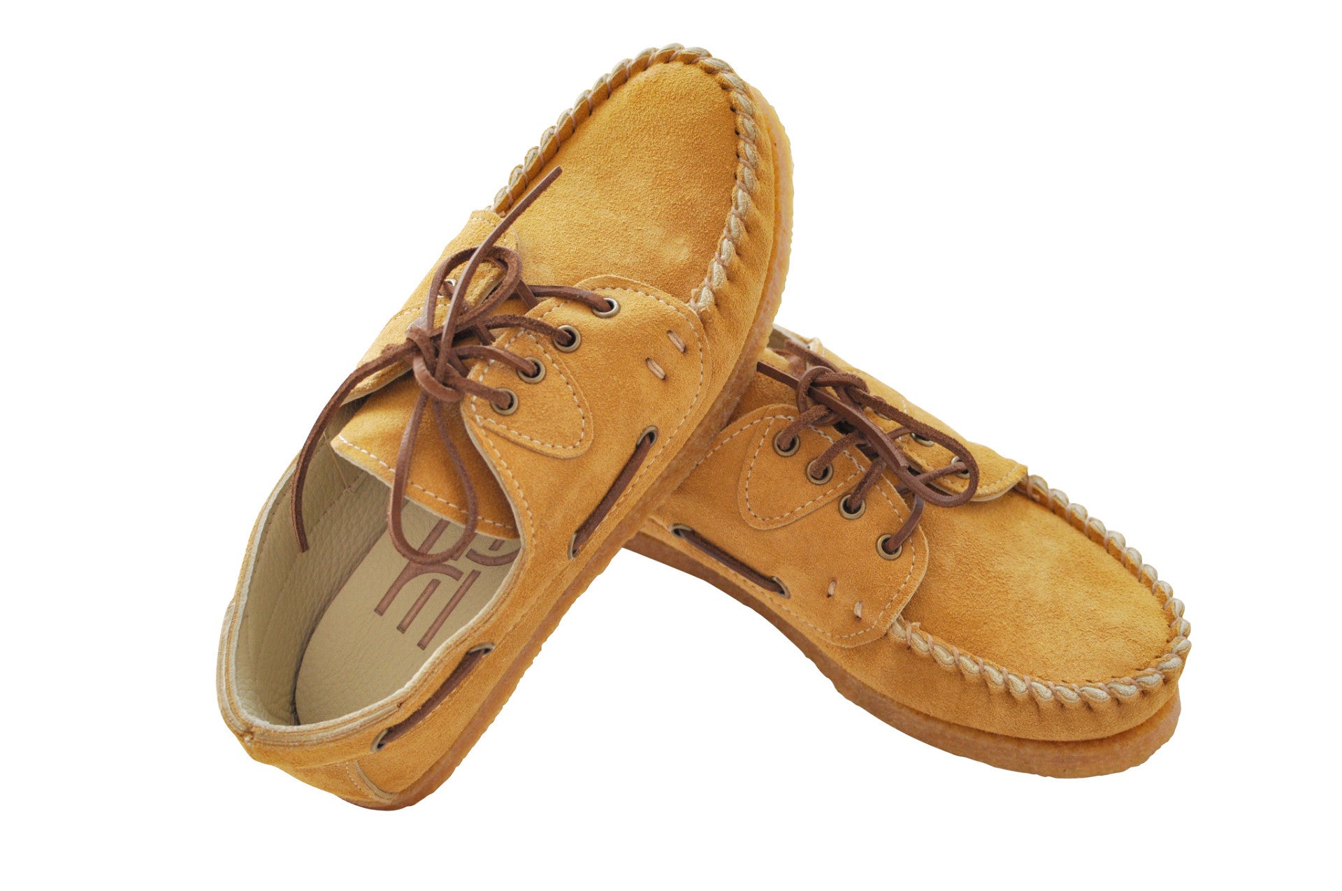 Crafted with precision, the Buck Honey Oxford Moccasin features meticulous hand-sewing in a deep honey suede, complemented by a luxurious creme deerskin leather lining for an exceptionally comfortable fit. Distinctive attributes encompass eight elegant antique brass eyelets, and robust rawhide leather laces.