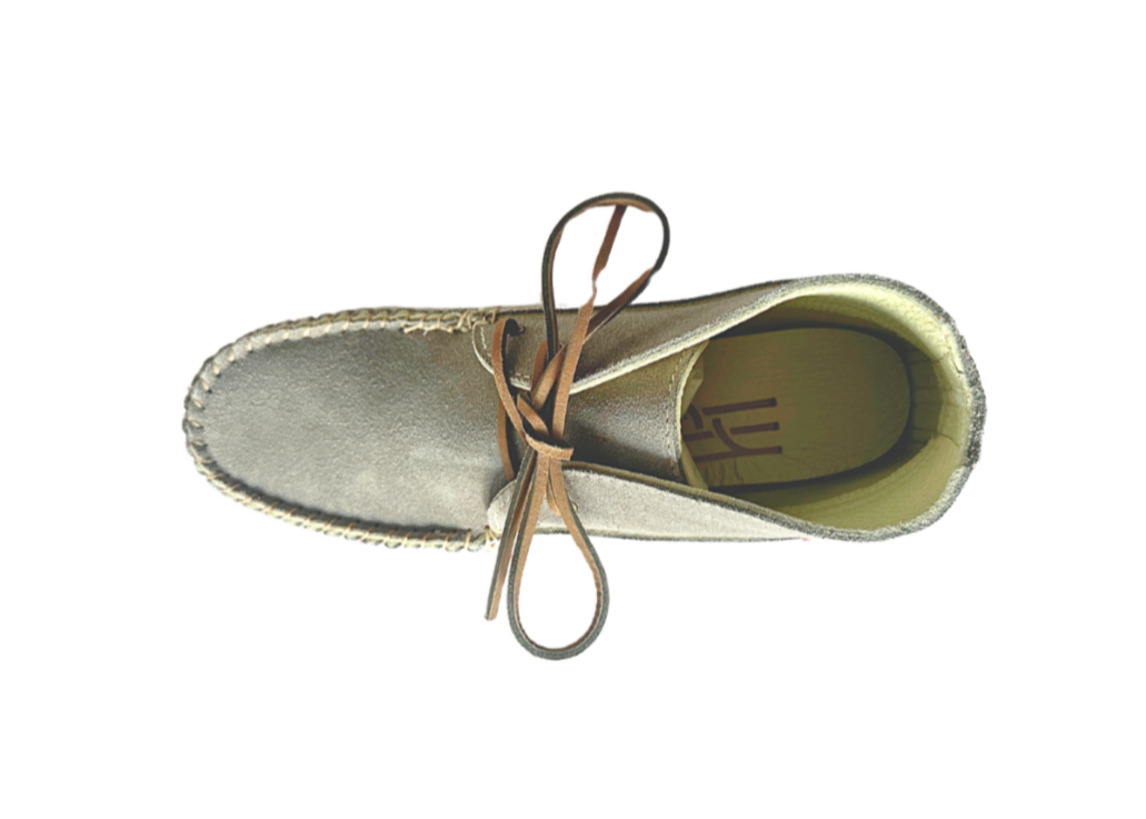 Crafted from suede and featuring a luxurious creme deerskin leather interior and insole for unparalleled comfort, the Grey Chukka is meticulously hand-sewn. Noteworthy elements comprise a 7mm non-slip tread flex sole, two antique brass eyelets, and rawhide leather laces. Please note that each pair is custom-made for every customer, necessitating a 2-3 week delivery lead time. These shoes are proudly manufactured in the United States.