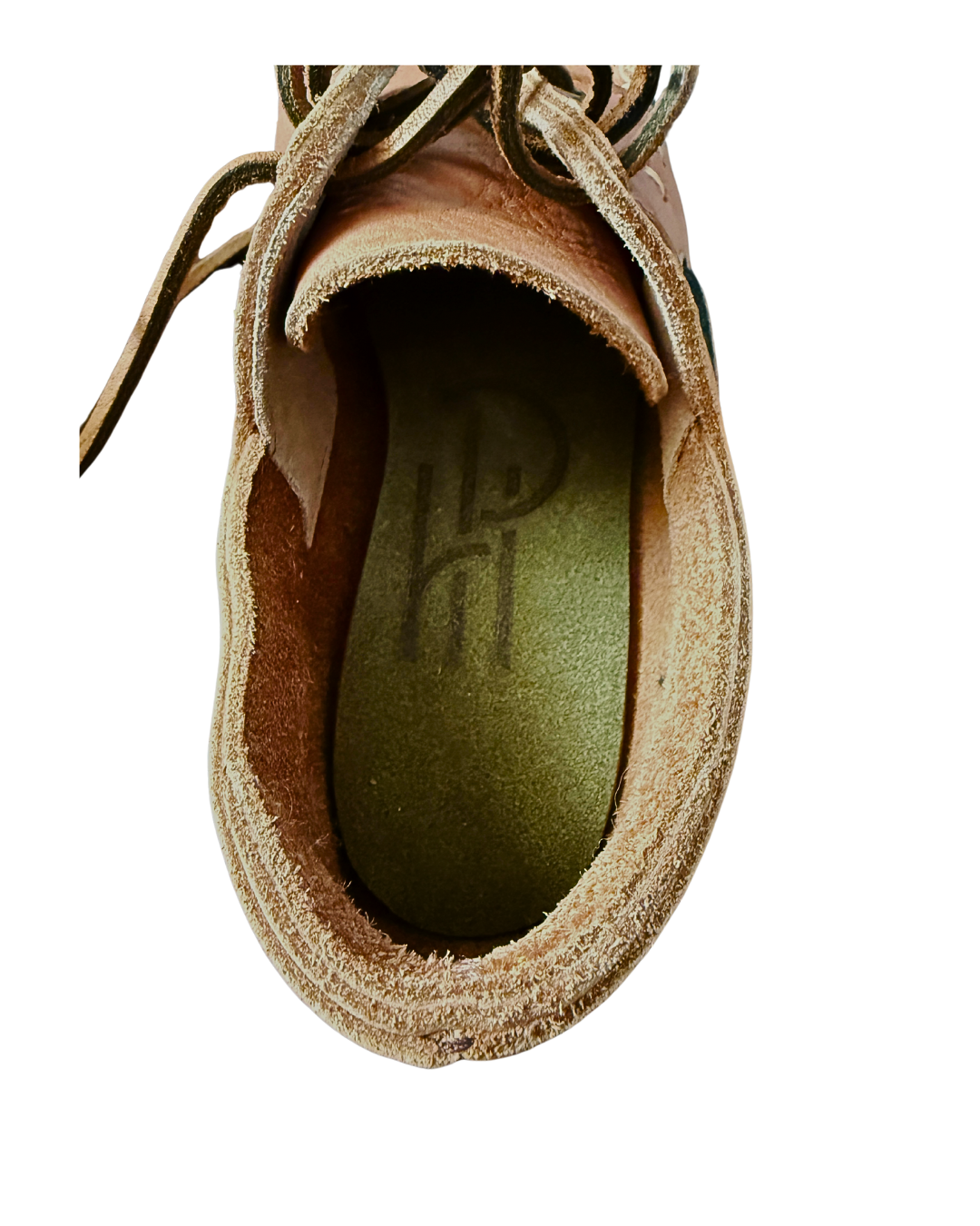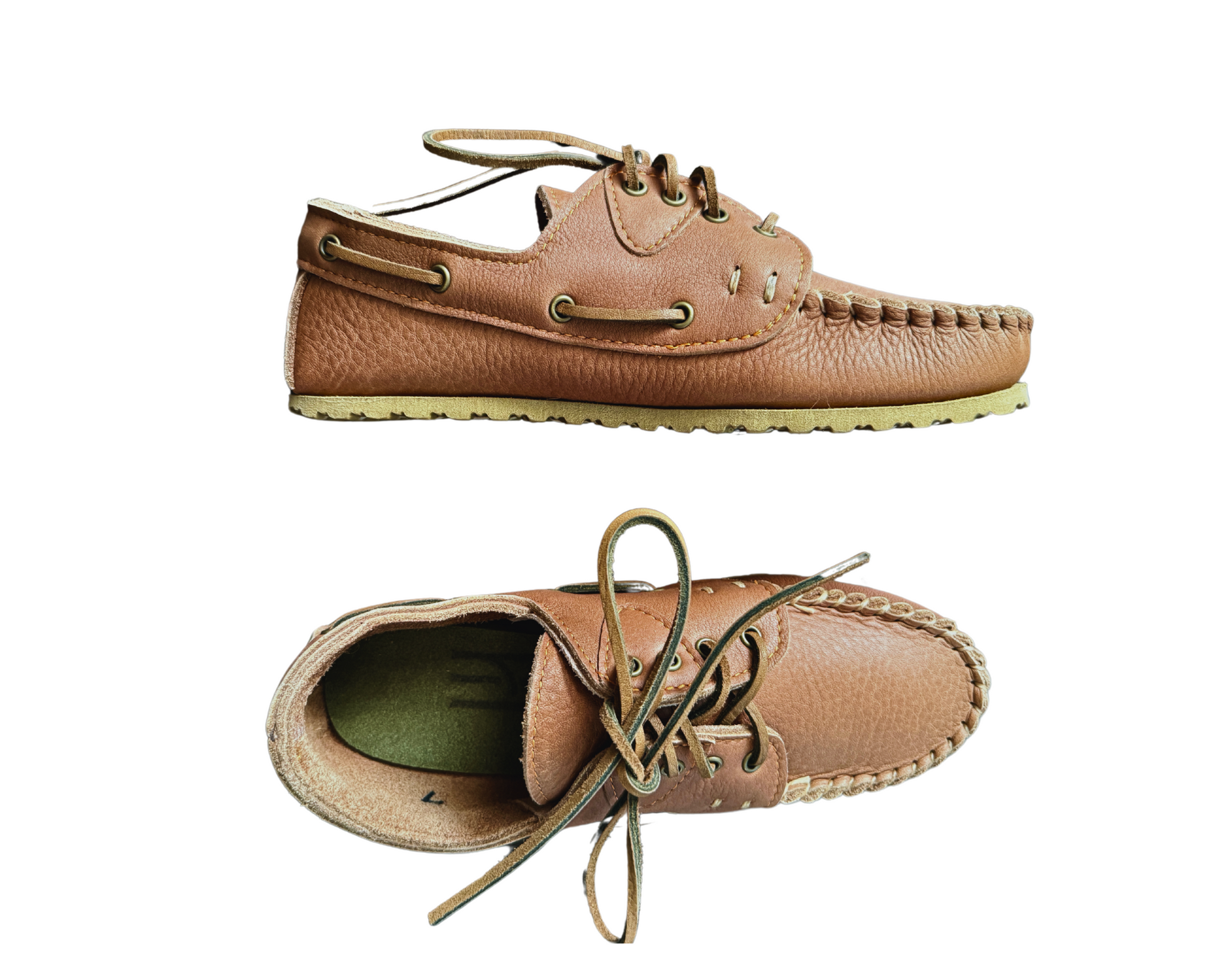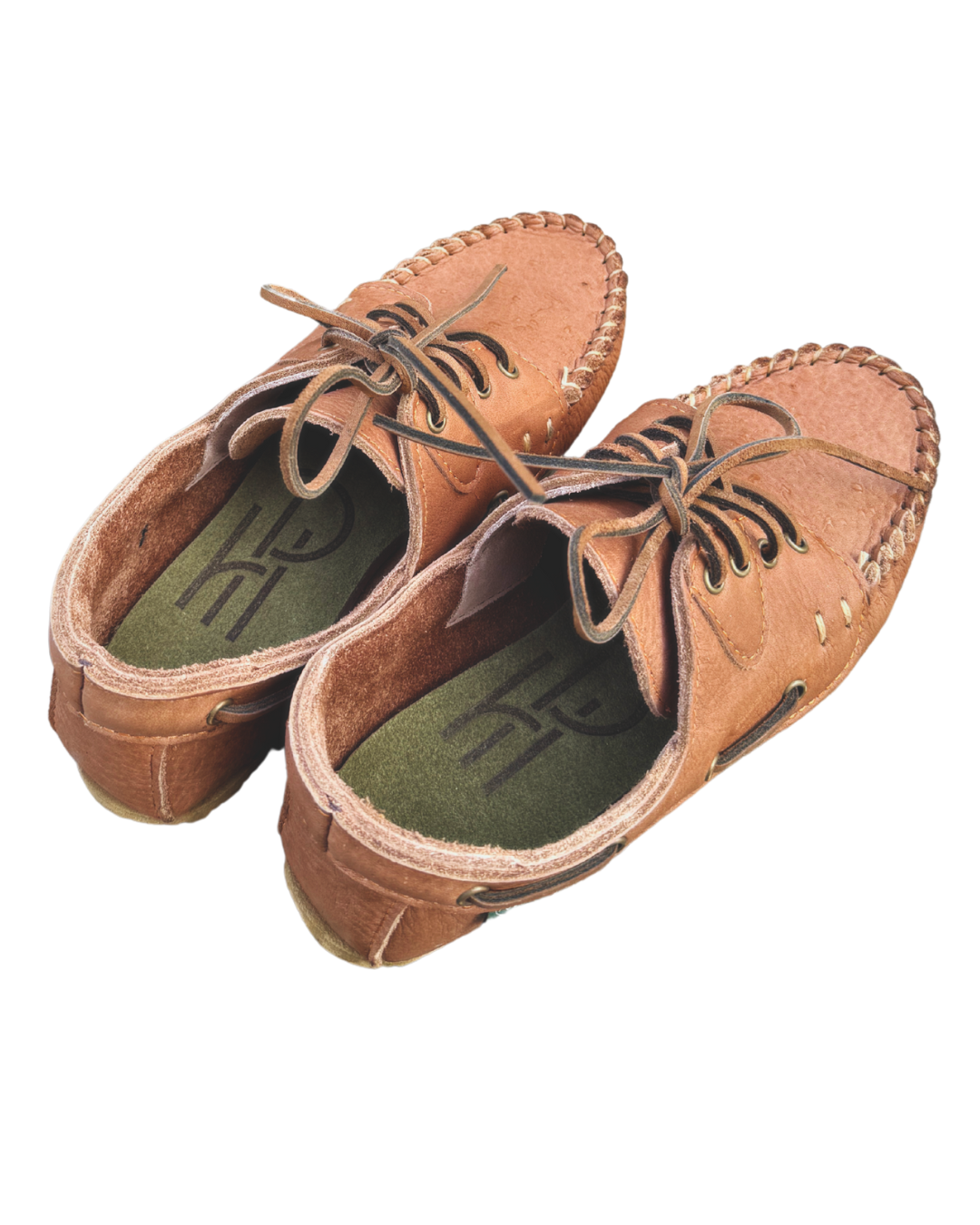 Crafted with precision, the Loam Oxford Moccasin features meticulous hand-sewing in a rich brown cow hide leather, complemented by a luxurious moss green suede Poron interior lining for an exceptionally comfortable fit. Distinctive attributes encompass the 7mm cushion flex sole, eight elegant antique brass eyelets, and robust rawhide leather laces, ecru toe threading and orange stitch.