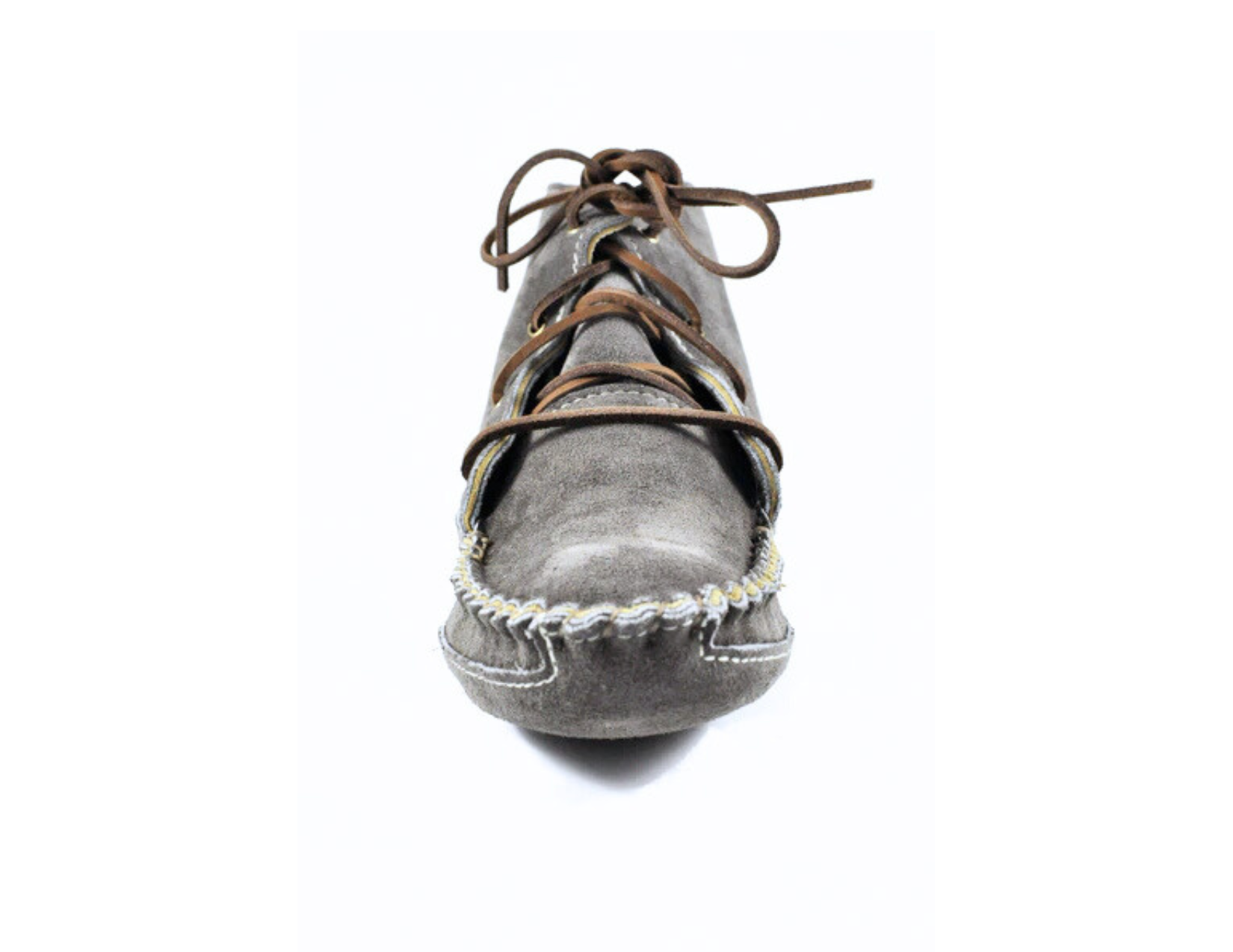 The Canoe Boot, meticulously handcrafted in supple suede, boasts a creme deerskin leather lining in both its interior and insole for exceptional comfort. Notable features encompass the suede wrap sole, eight elegant antique brass eyelets, and sturdy rawhide leather laces. Over time, this grey will become mildly more dark.