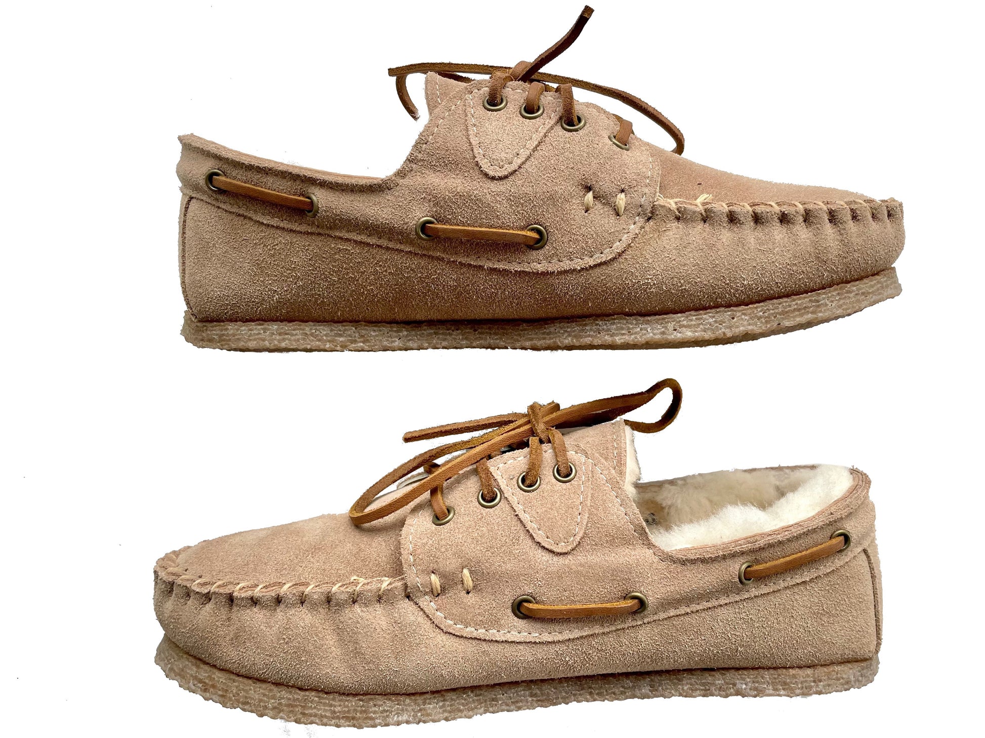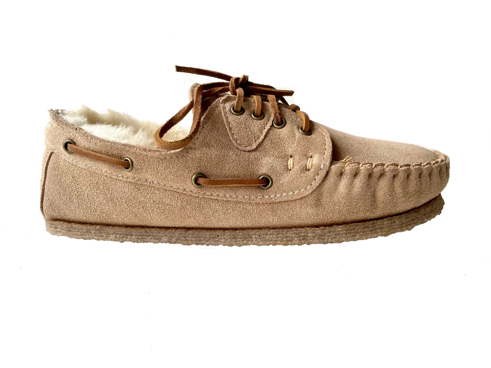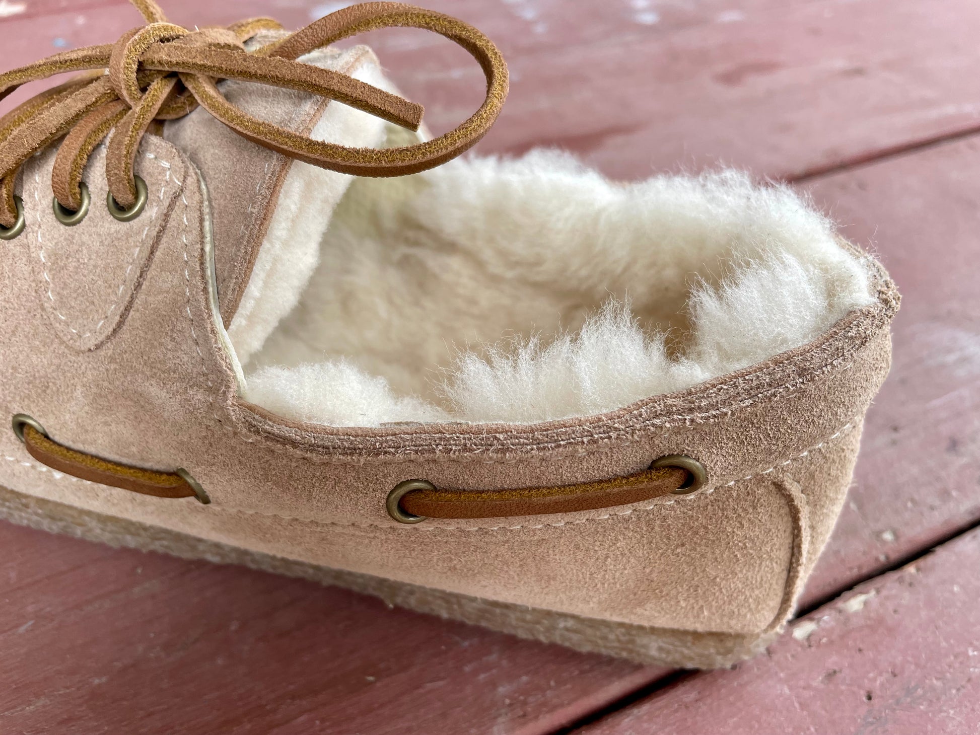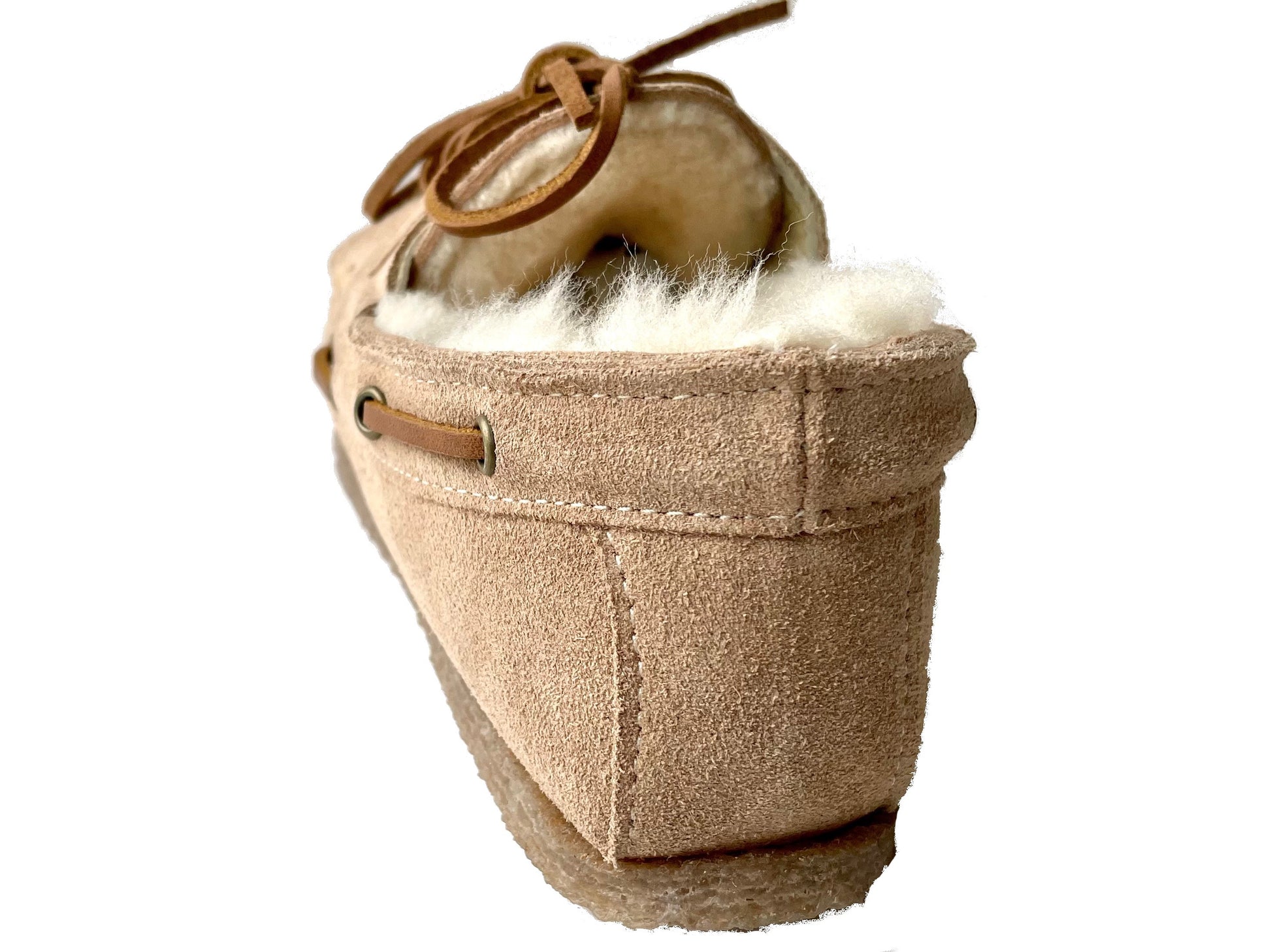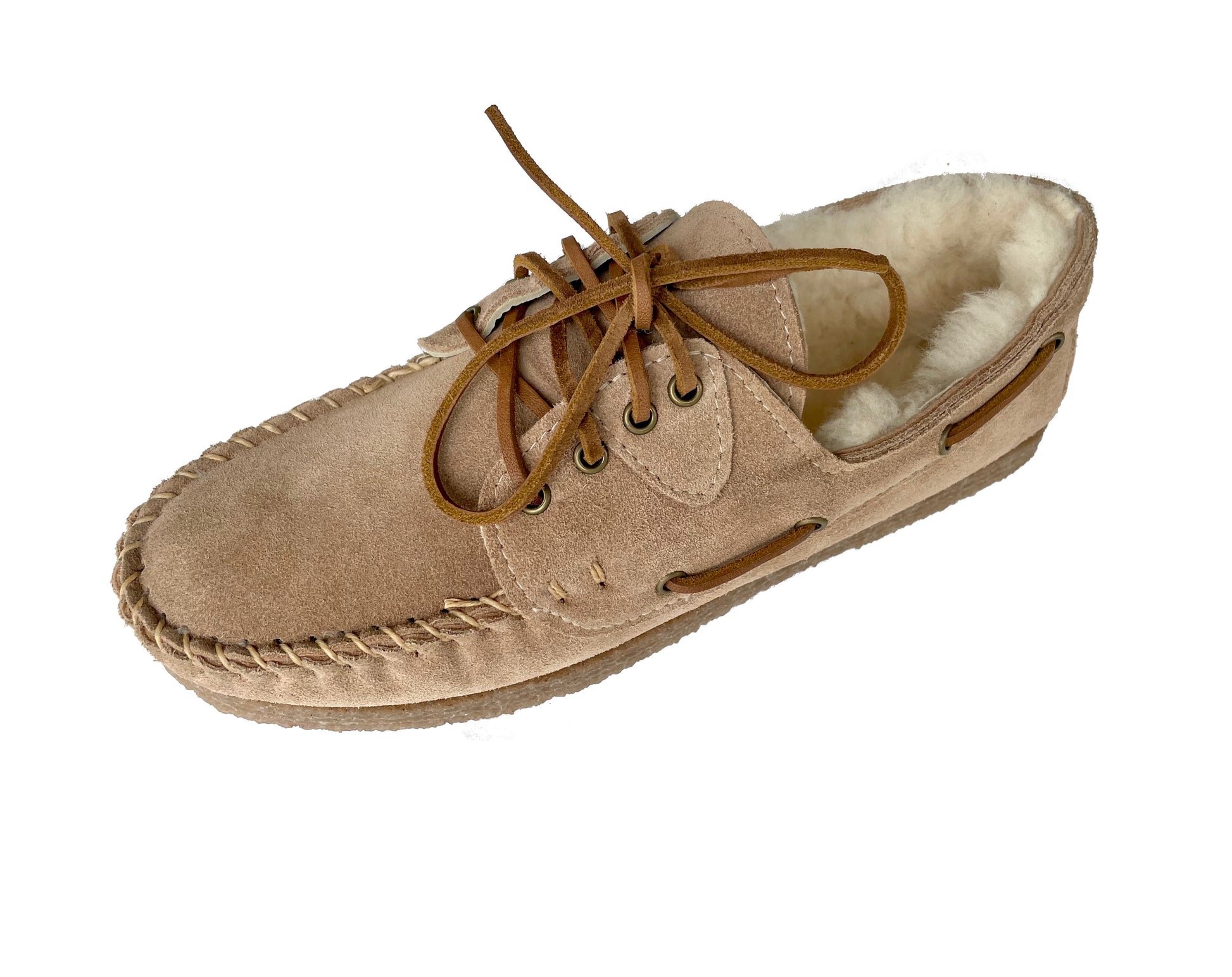 Meticulously handcrafted, the Sand Oxford Moccasin boasts suede construction and a plush cream sheepskin interior, ensuring the utmost comfort and a supremely soft experience for your feet. Notable features encompass eight elegant antique brass eyelets, and durable rawhide leather laces.