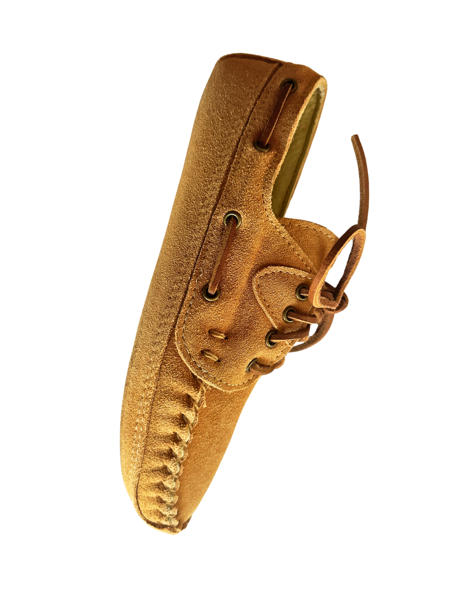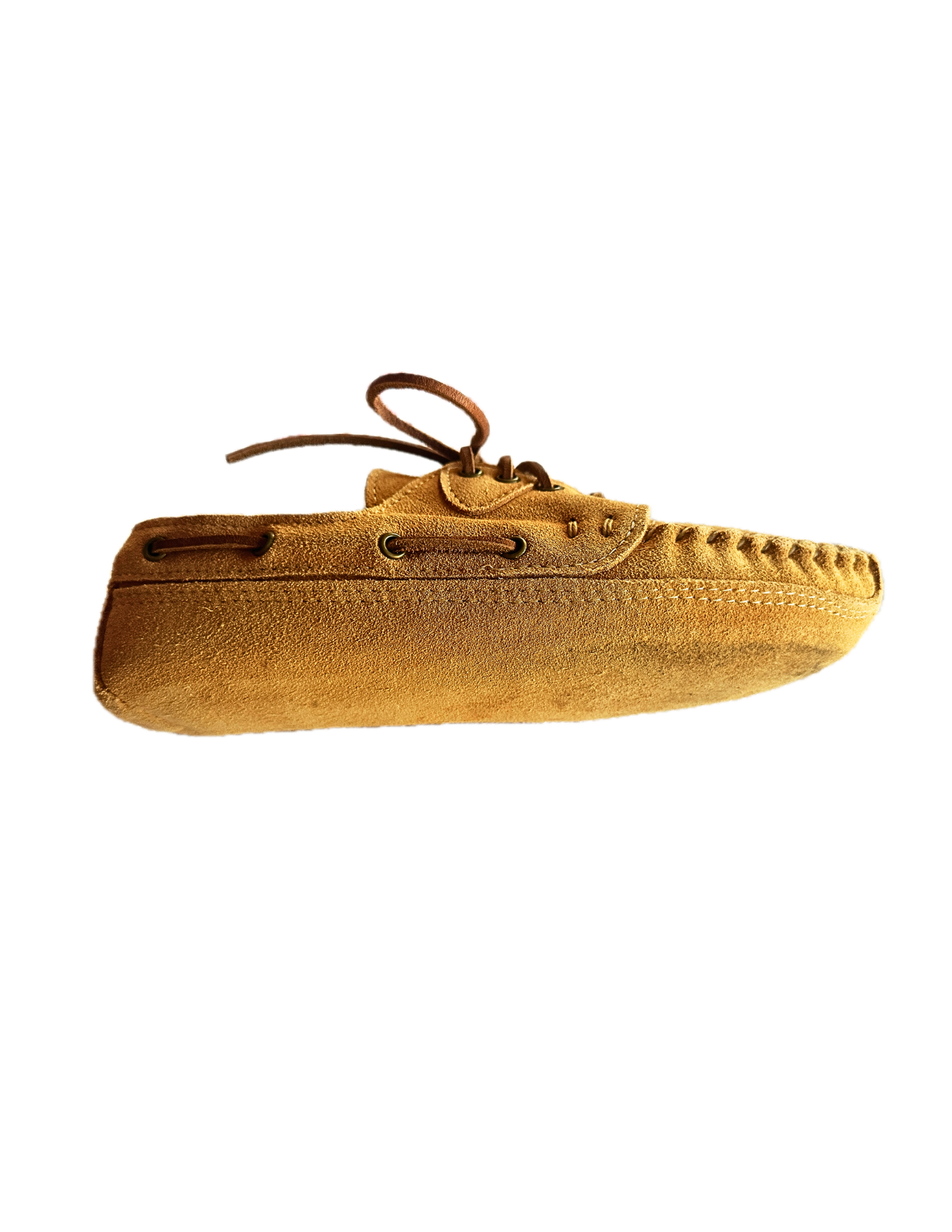 The exterior is complemented by a luxurious creme deerskin leather lining for an exceptionally comfortable fit. Distinctive attributes encompass a wrap suede sole, elegant antique brass eyelets, and robust rawhide leather laces.
